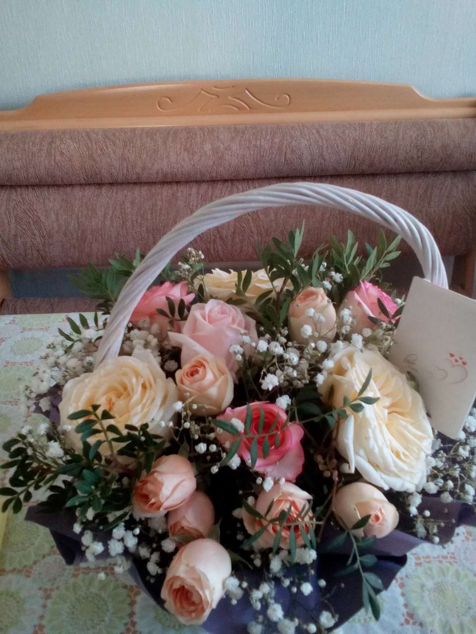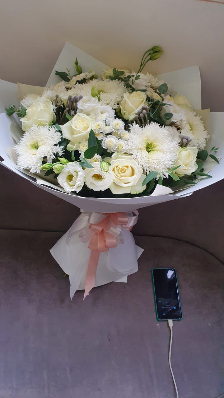 Георгина белая, маттиола голубая, роза кустовая розовая, куст малины. Упаковка (лента, пленка, крафт, сетка, пленка матовая)
