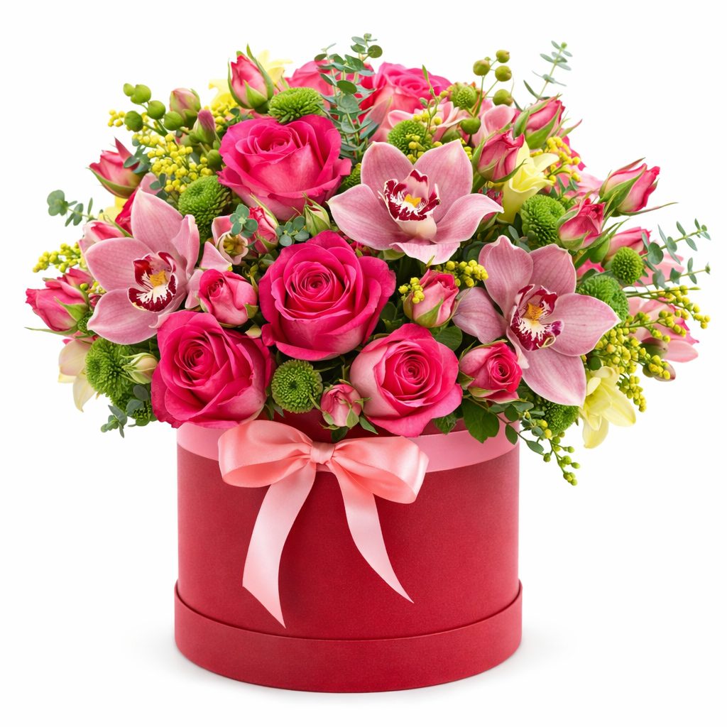 Орхидея розовая, роза одноголовая розовая, фрезия белая, хризантема кустовая зеленая, гиперикум, солидаго, эвкалипт. Упаковка (шляпная коробка, квадратный бокс, коробка сердце, оазис)